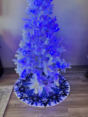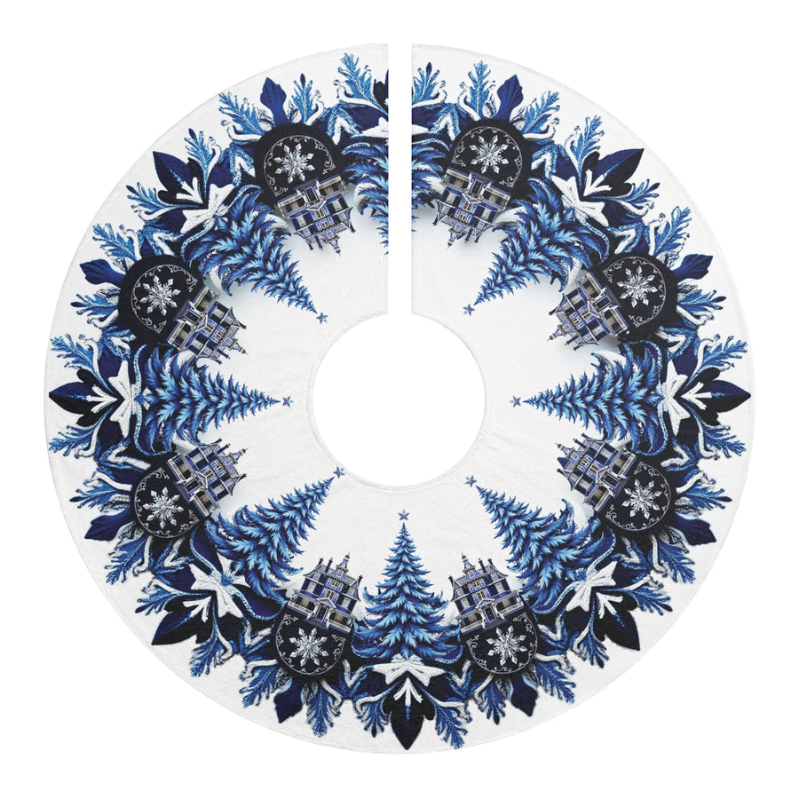 The beautifully detailed design on the top features snow-covered trees, majestic castles, and festive florals in stunning shades of blue and white. The back of the skirt is solid white, providing a clean and classic look underneath your tree.