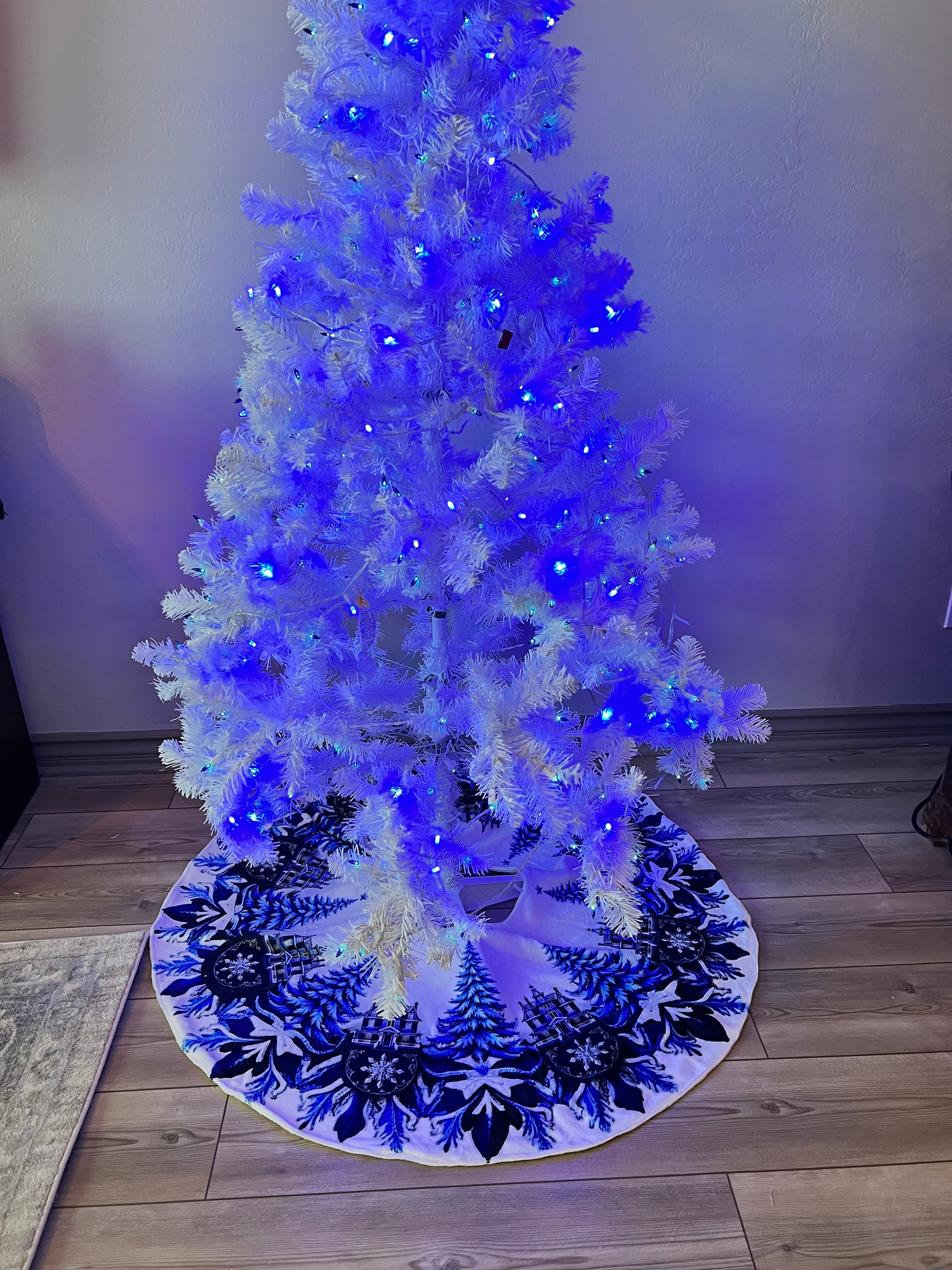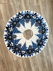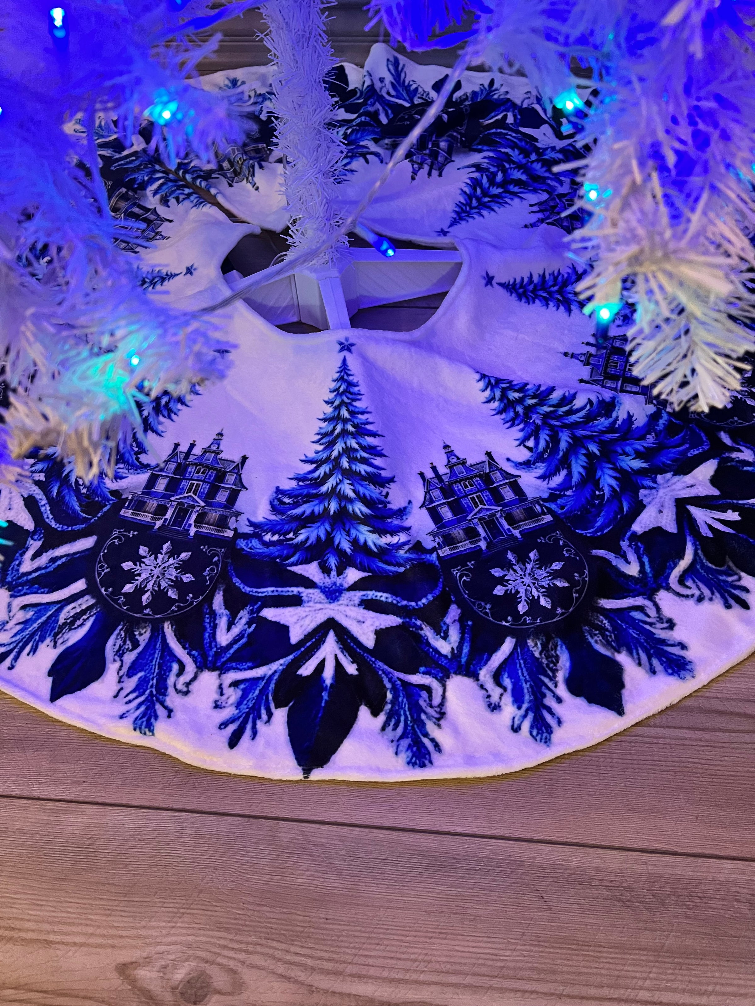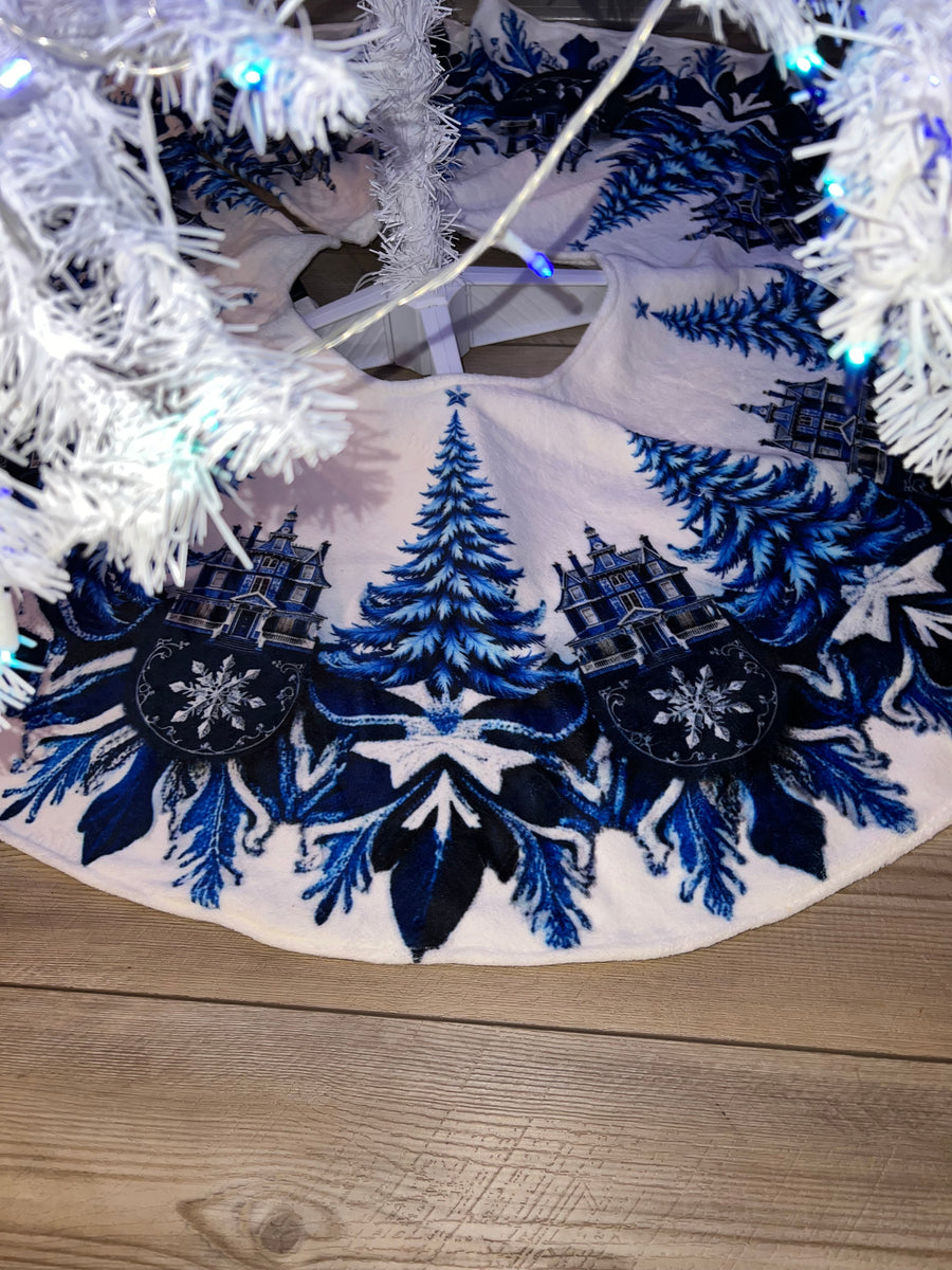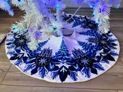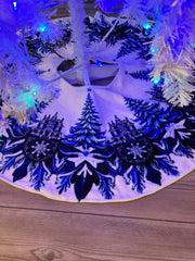 Blue and White Trees and Snowflakes Christmas Tree Skirt, Round Tree Skirt, Christmas Tree Decor