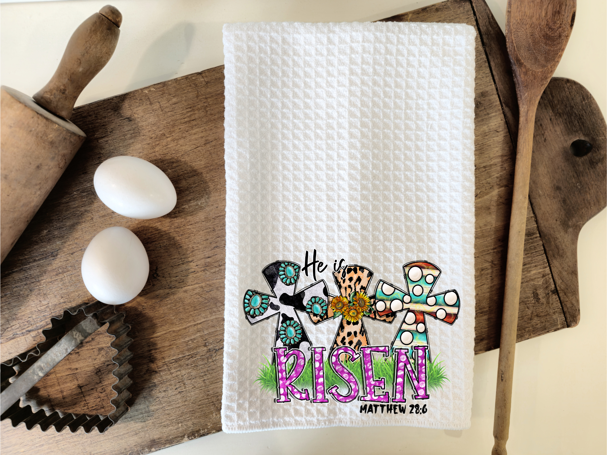 He Is Risen with Three Crosses Kitchen Towel, gift for baker, birthday gift, Easter Gift