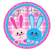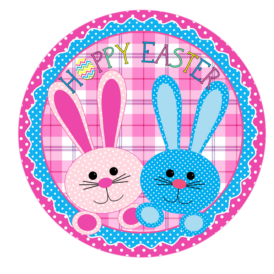 Hoppy Easter Pink & Blue Bunnies Wreath Sign, Round Metal Sign, Door Hanger
