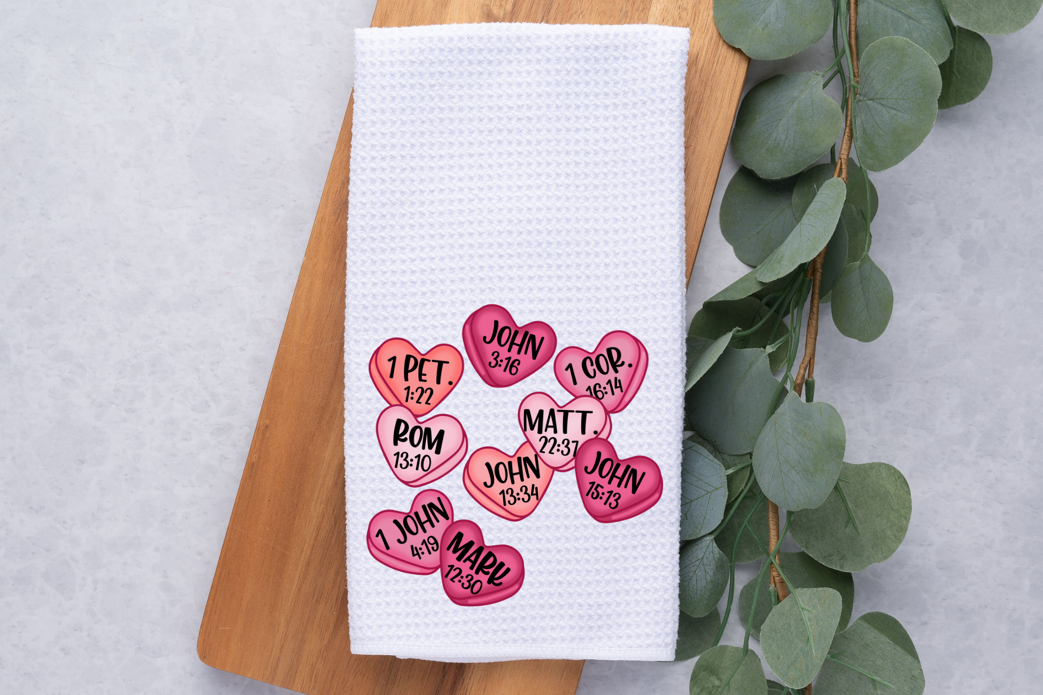 Valentines Bible Verse Conversation Hearts Kitchen Towel, gift for baker,Valentine Gift