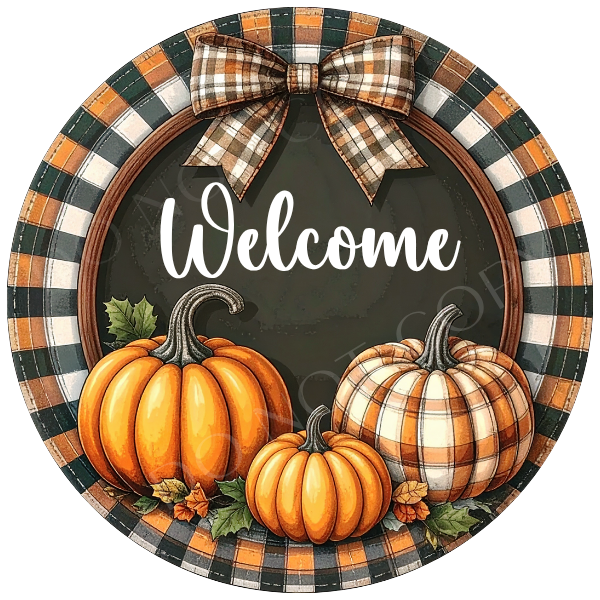 Welcome Plaid Fall Wreath Sign, Round Metal Sign For Wreaths, Wreath Attachment, Fall Pumpkin Wreath Sign